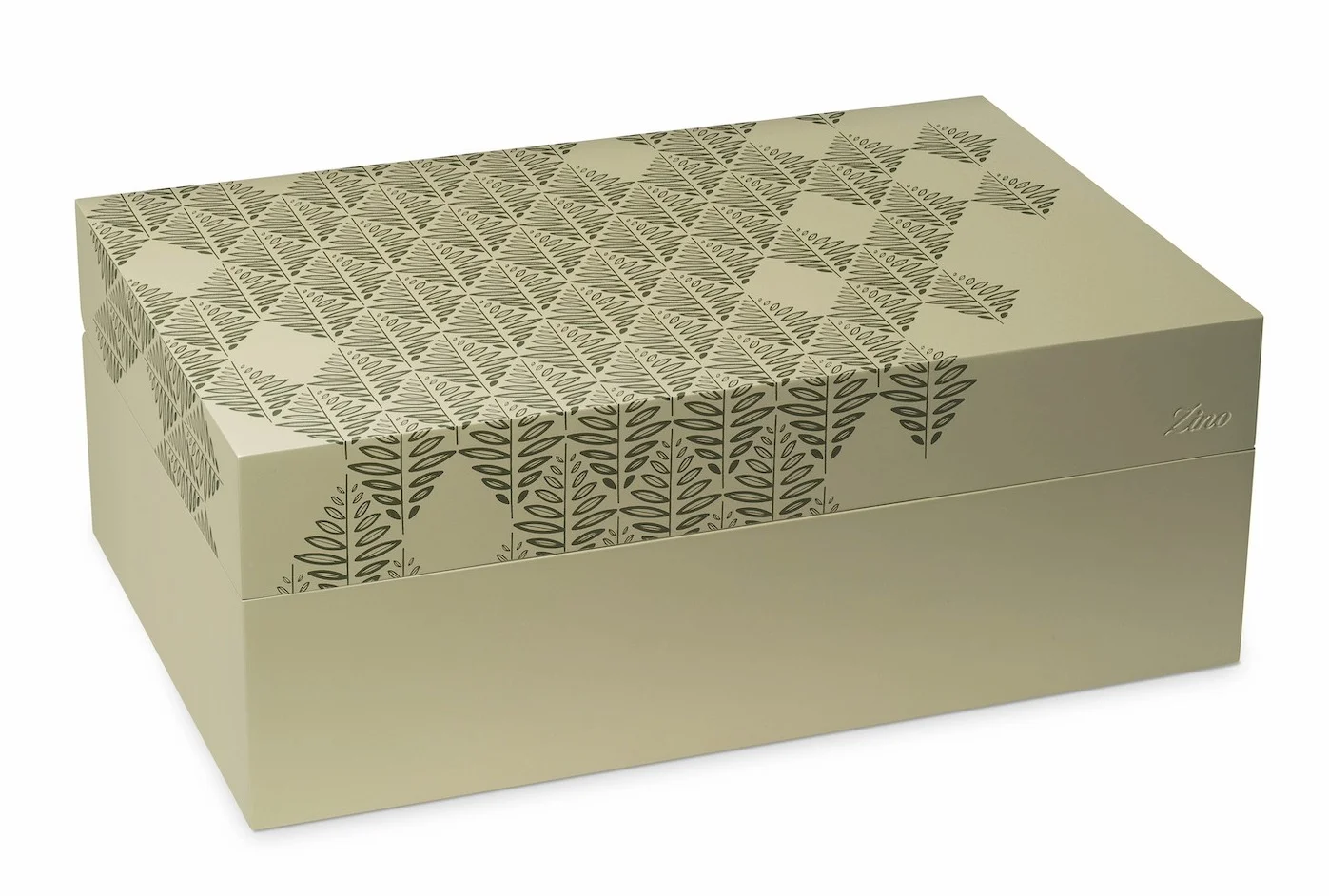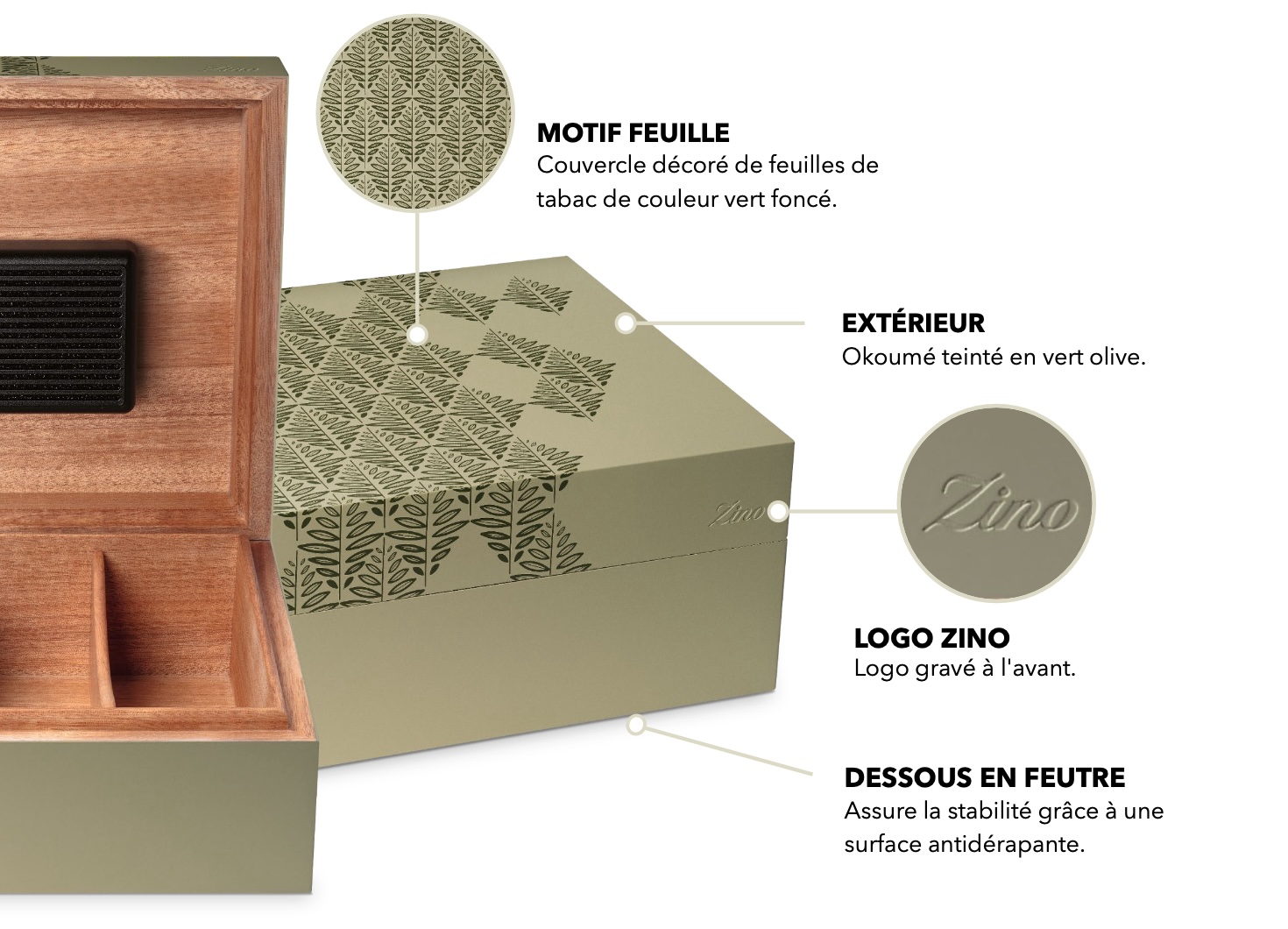 Élégante, fiable et pensée pour les amateurs exigeants, la cave Zino 60 cigares offre un équilibre parfait entre design contemporain et performance d’humidification. Avec son extérieur en okoumé teinté vert olive et ses motifs de feuilles de tabac gravés sur le couvercle, cette cave séduit immédiatement par sa sobriété luxueuse et sa sophistication naturelle.