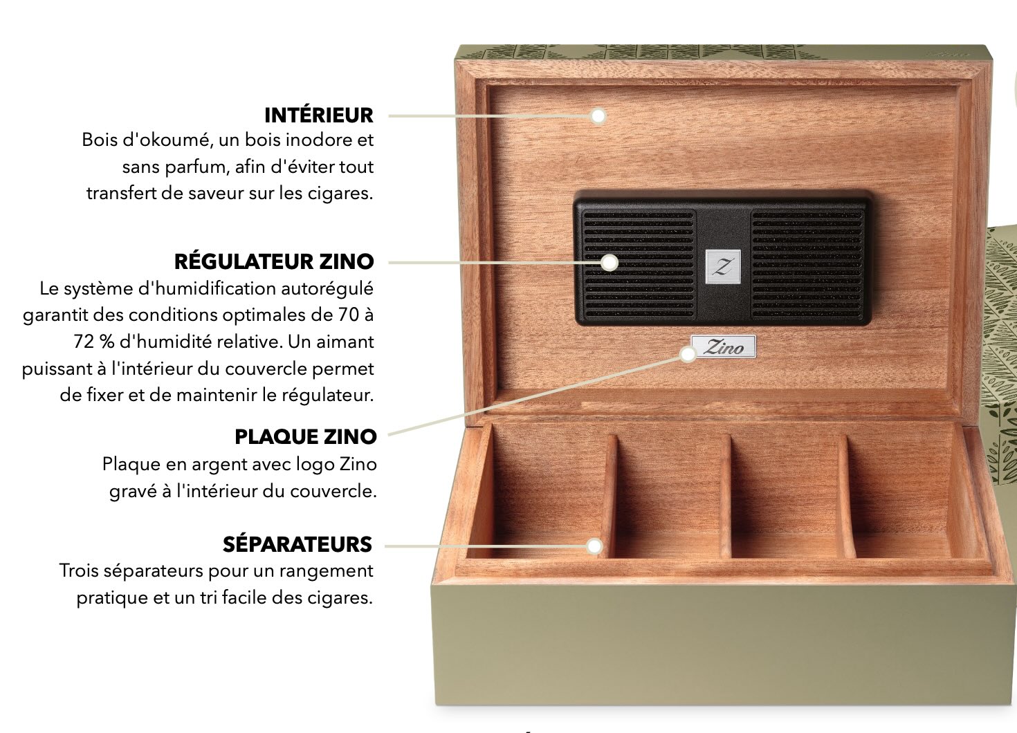 À l’intérieur, le bois d’okoumé naturel — inodore et sans parfum — préserve scrupuleusement les arômes d’origine de vos cigares. Le couvercle accueille une plaque Zino en argent ainsi qu’un régulateur Zino magnétique, un système d’humidification autorégulé garantissant une stabilité optimale entre 70 et 72 % d’humidité relative. Grâce à son aimant intégré, le régulateur reste parfaitement maintenu, même lors des manipulations répétées.