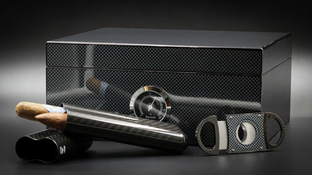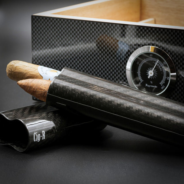 Ce coffret Carbone Cig-R réunit trois accessoires essentiels dans une esthétique moderne et technique: une cave à cigares finition carbone, un étui rigide en fibre de carbone et un coupe-cigare