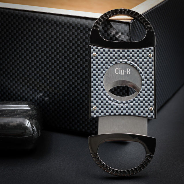 Le coupe-cigare double-lames assorti présente un décor carbone dans le même esprit technique.