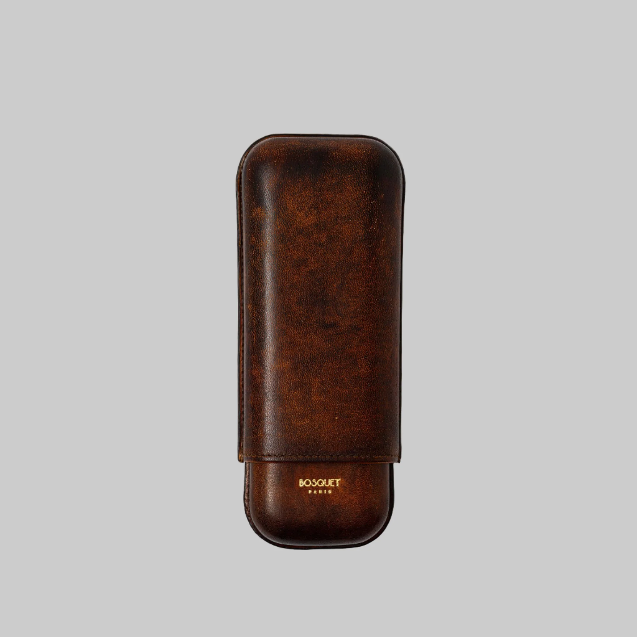 Cet étui à cigares Bosquet Paris pour deux pièces se distingue par son cuir lisse patiné à la main, véritable signature esthétique de la maison. Chaque exemplaire présente des nuances uniques, fruit d’un travail artisanal minutieux, où le cuir est lentement teint et fini pour révéler profondeur, relief et caractère.