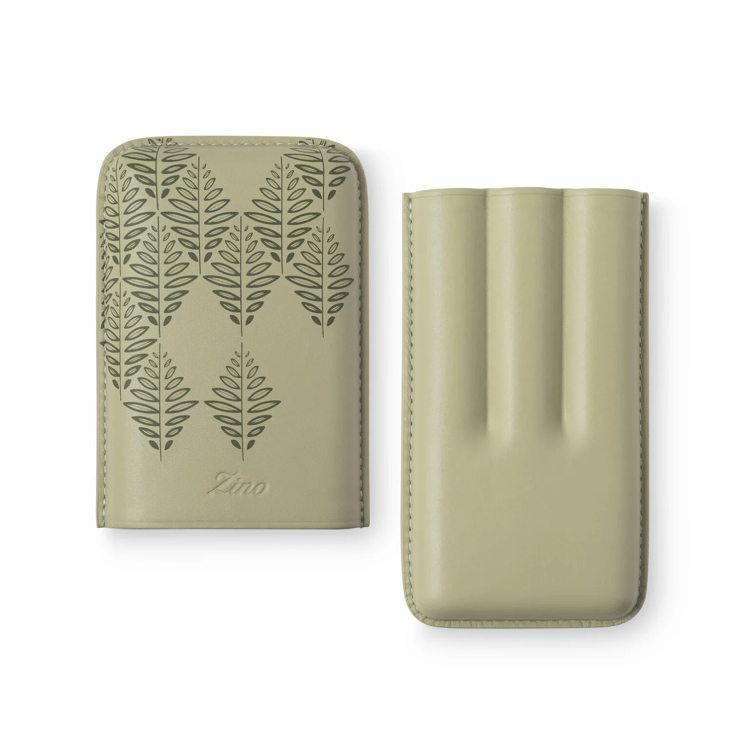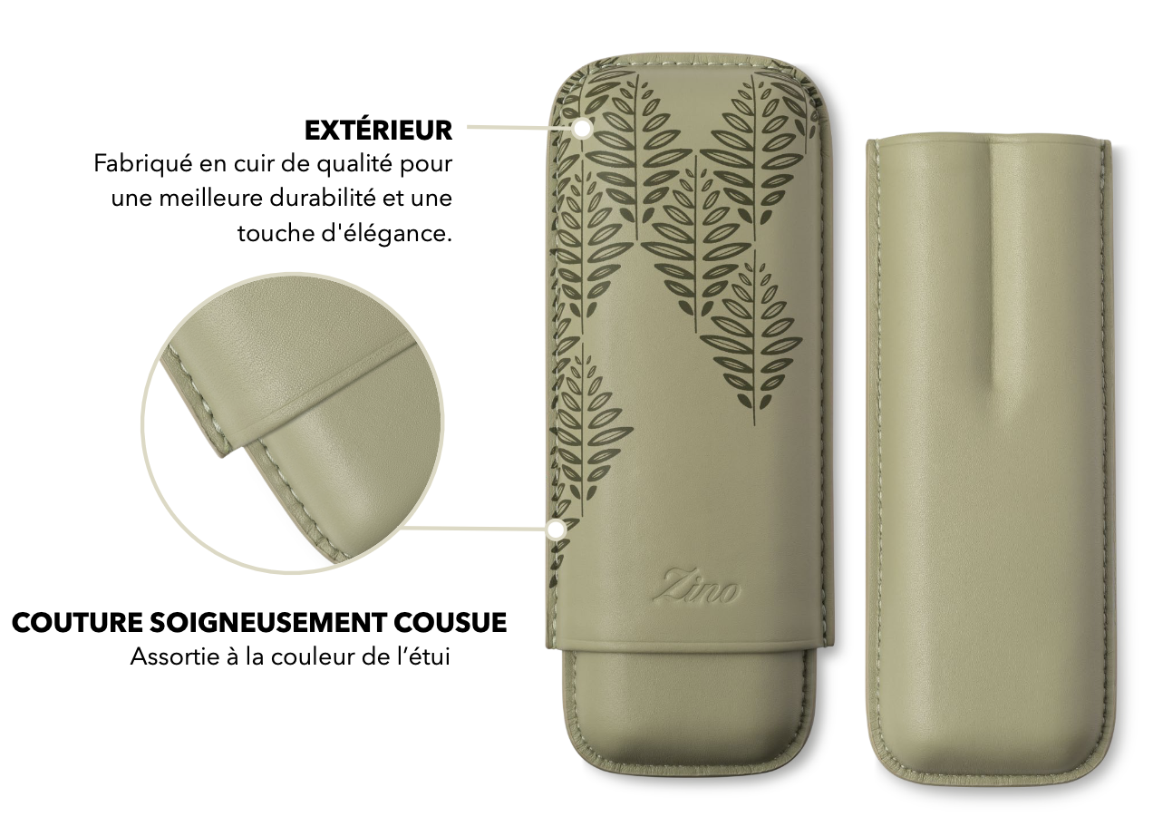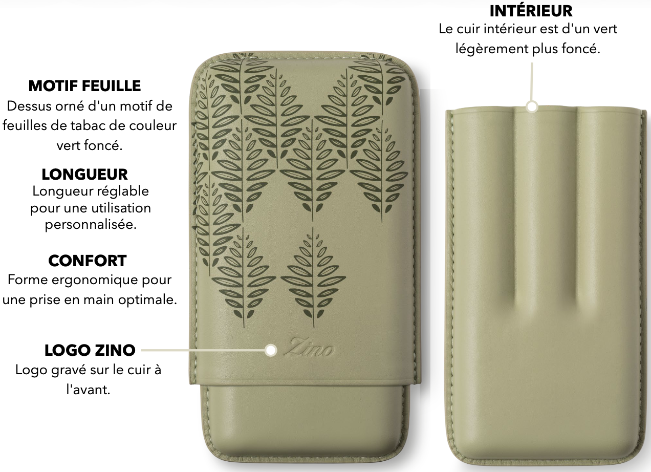 Élégants, pratiques et conçus pour accompagner vos cigares au quotidien, les étuis Zino allient un design contemporain à une qualité de fabrication irréprochable. En cuir vert olive, souple et résistant, ils présentent un motif de feuilles de tabac délicatement imprimé sur le dessus, signature visuelle de la collection.
