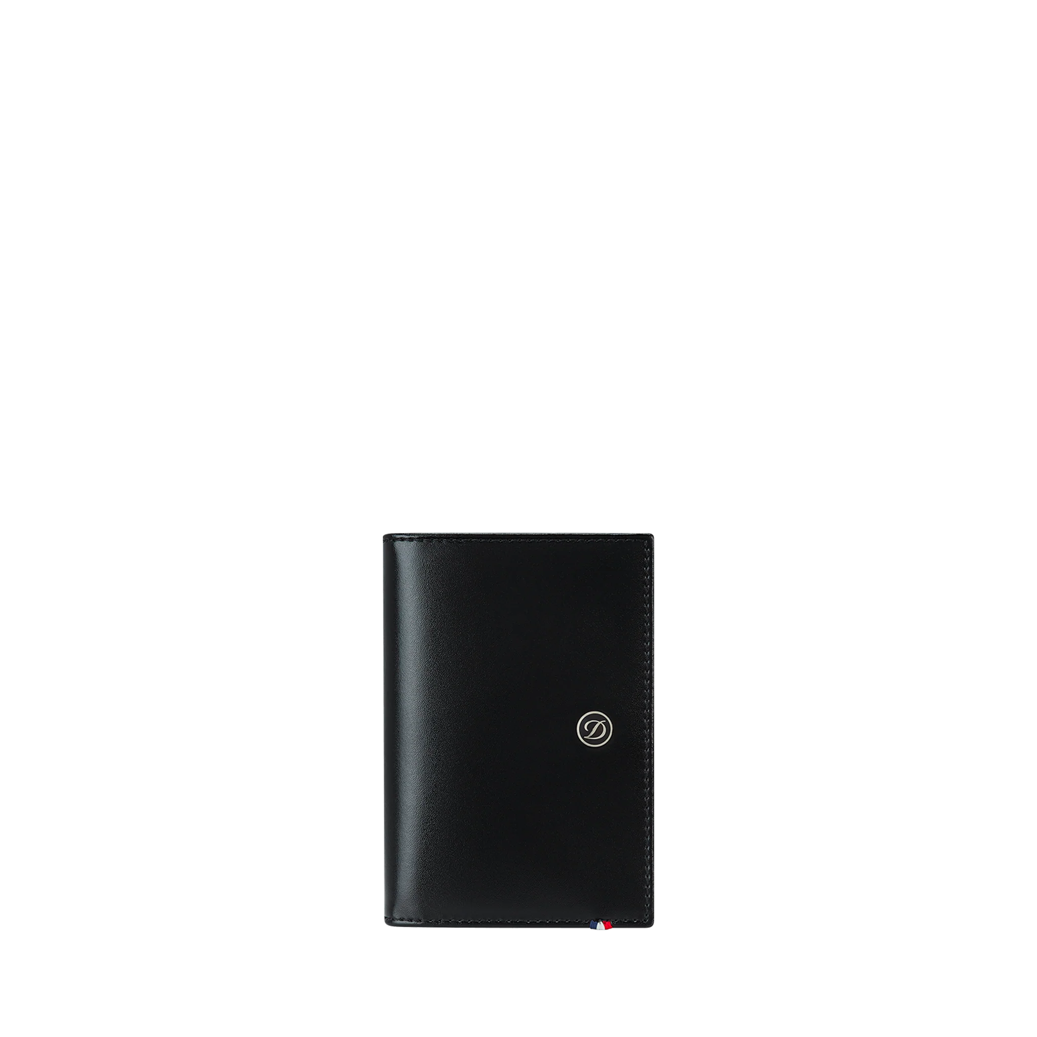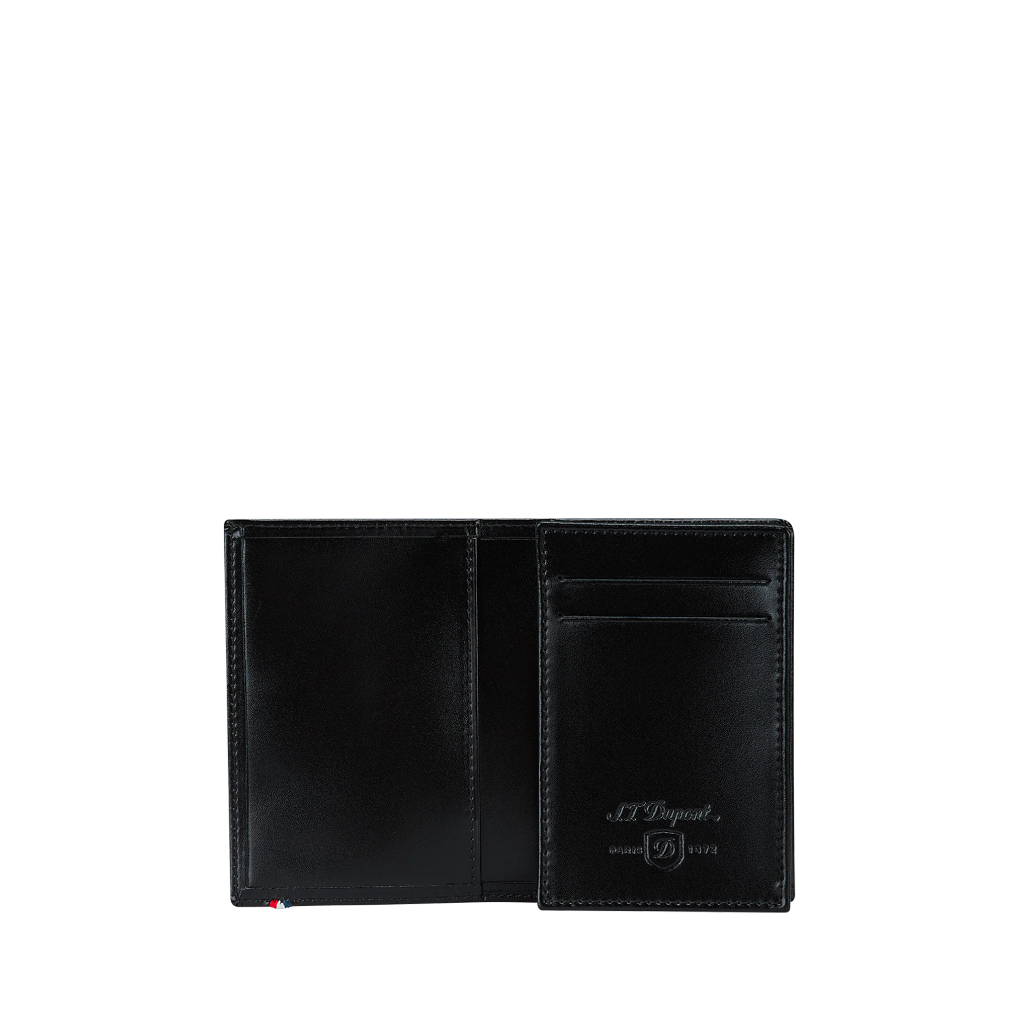 Son design épuré abrite deux fentes pour cartes, un compartiment latéral à soufflet pour cartes de visite ou reçus, ainsi qu’un compartiment plat supplémentaire. Le logo S.T. Dupont embossé à l’intérieur et le subtil détail tricolore viennent signer ce modèle avec distinction.
