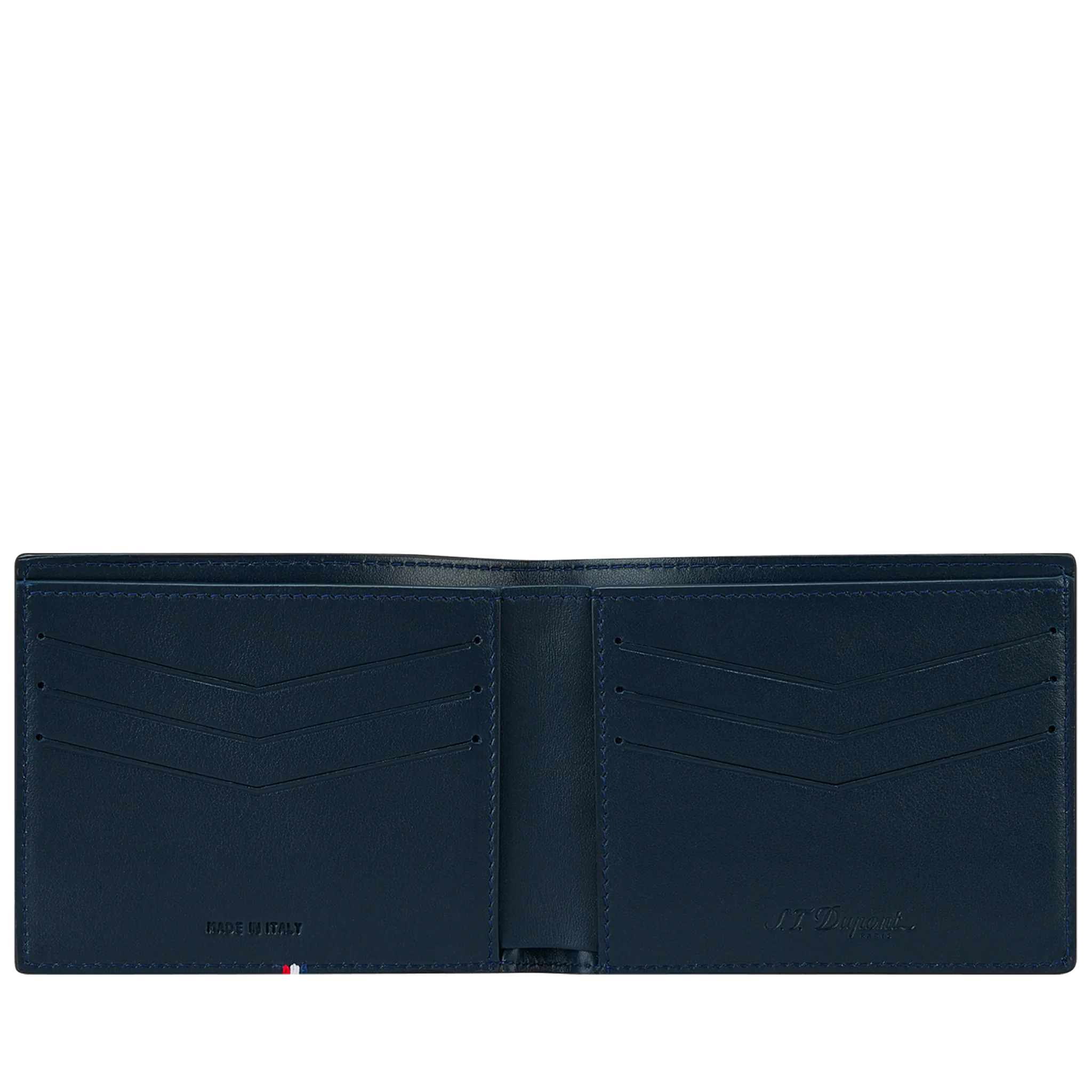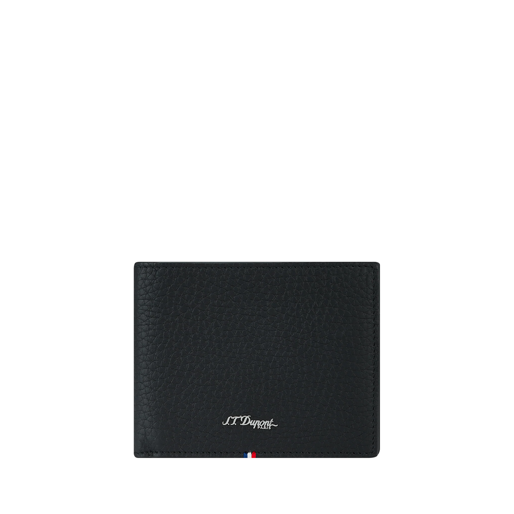 Ce portefeuille offre six emplacements pour cartes, un compartiment à billets spacieux ainsi que deux poches latérales pour vos papiers. Sa doublure intérieure bleu nuit contraste subtilement avec l’extérieur noir, rehaussé par le détail tricolore et la signature argentée S.T. Dupont.