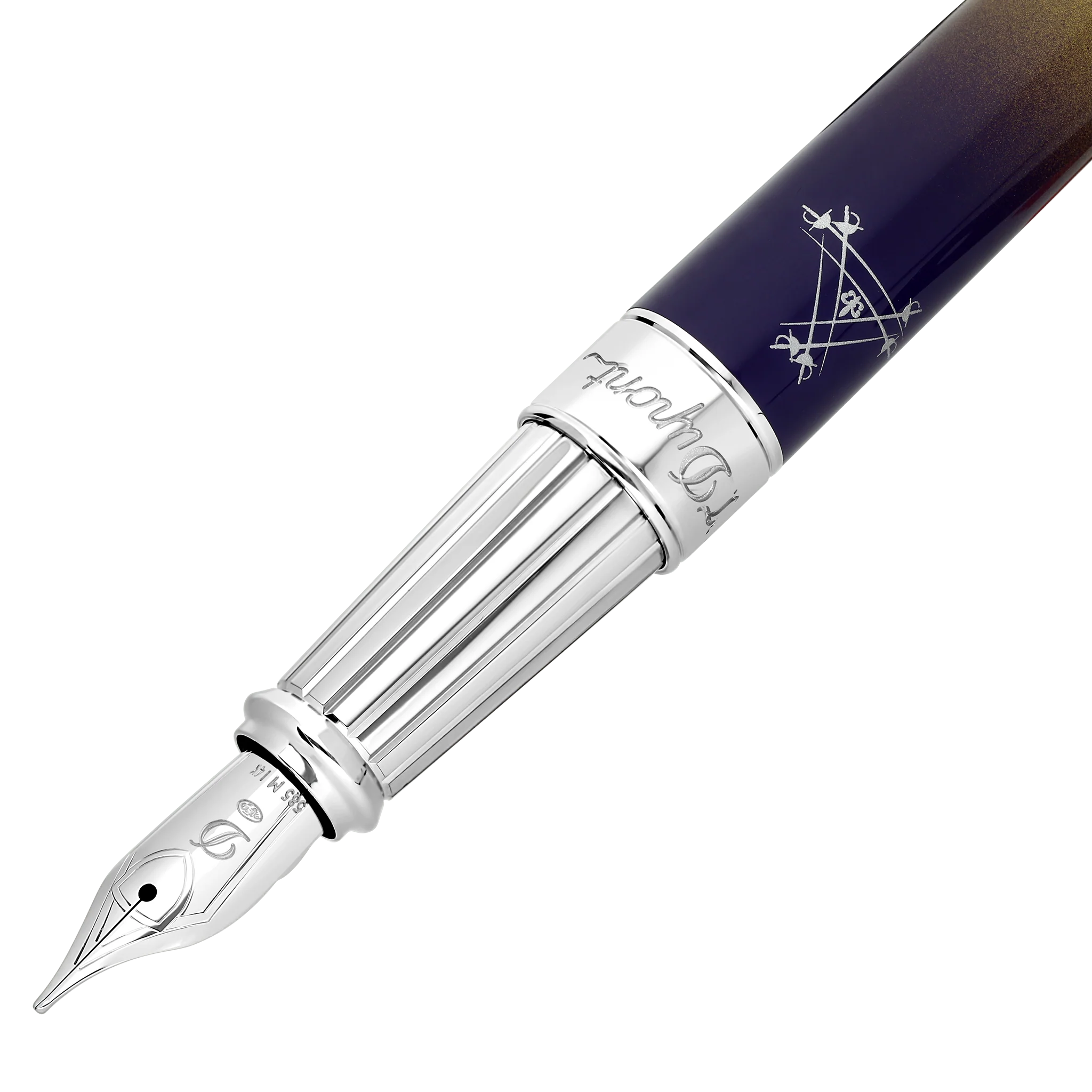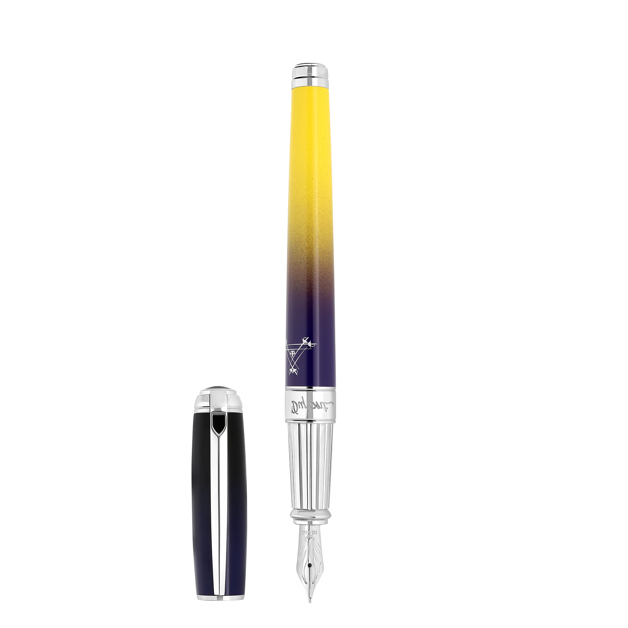 Le fût révèle un dégradé saisissant : un bleu nuit presque noir au sommet, glissant vers un violet profond avant de s’illuminer d’un jaune doré éclatant. Une laque S.T. Dupont brillante, parfaitement lisse, qui joue avec la lumière et évoque la lueur lunaire traversant l’obscurité.